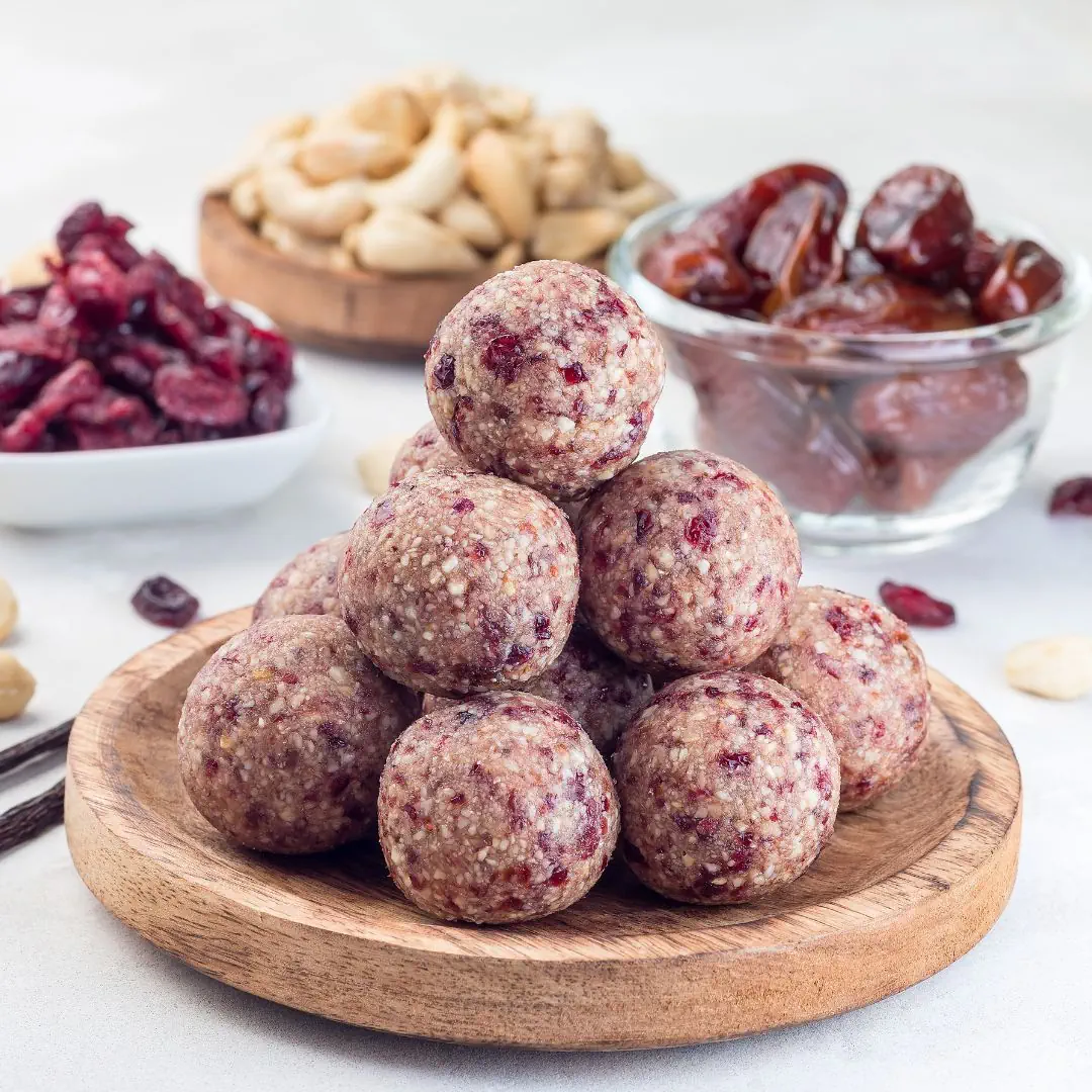 Des petites bouchées chargées d’ingrédients sains (datte, noix de cajou, cranberries, noisettes et amandes)